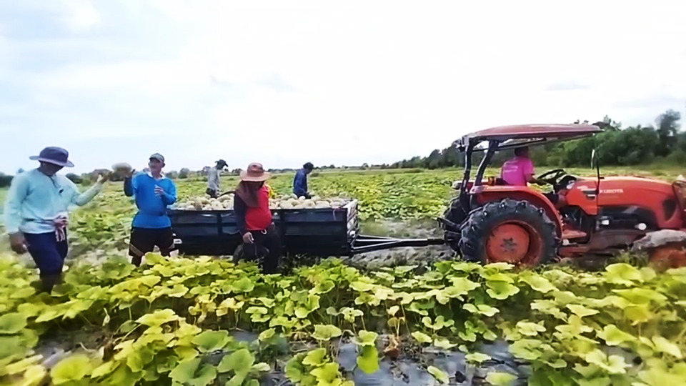 เกษตรกรสงขลา ลงแขกเก็บฟักทองพันธุ์ข้าวตอกในพื้นที่ 10 ไร่ ใช้รถแทรกเตอร์ช่วยทุ่นแรง ครึ่งวันเก็บผลผลิตได้กว่า 8 ตัน สร้างรายได้ไม่น้อยกว่า 80,000 บาท พร้อมเผยการวางแผนปลูกผักหมุนเวียนตลอดปี ลดความเสี่ยงจากฤดูฝน