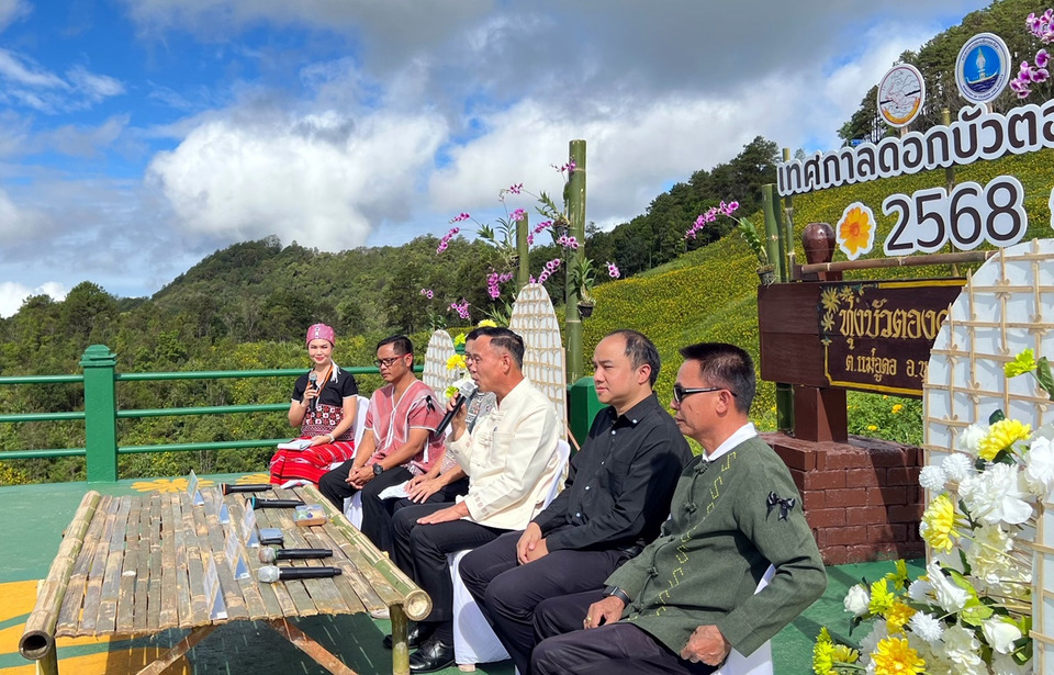 เมื่อวันที่ 6 พ.ย.68 ที่ลานจุดชมวิววนอุทยานทุ่งบัวตอง ดอยแม่อูคอ ตำบลแม่อูคอ อำเภอขุนยวมจังหวัดแม่ฮ่องสอน นายบุญลือ ธรรมธรานุรักษ์ รองผู้ว่าราชการจังหวัดแม่ฮ่องสอน เป็นประธานในพิธีแถลงข่าว โครงการส่งเสริการท่องเที่ยวเชิง กีฬา ดนตรีและศิลปะ จังหวัดแม่ฮ่องสอน กิจกรรมหลัก ส่งเสริมการท่องเที่ยวเทศกาลดอกบัวตองบาน อำเภอขุนยวม จังหวัดแม่ฮ่องสอน ภายใต้แผนปฏิบัติราชการประจำปีของจังหวัด ประจำปีงบประมาณ พ.ศ. 2569 โดยมีนางสาวริชญา ชะอุ่ม ท่องเที่ยวและกีฬาแม่ฮ่องสอน นายธารา ชมสมองเลิศ นายกองค์การบริหารส่วนตำบลแม่อูคอ นายภาคภูมิ วารปรีดีปลัดอำเภอกลุ่มงานควานมั่นคง ผู้แทนนายอำเภอขุนยวม และนายจำลอง จีโนเป็ง นายกเทศมนตรีตำบลขุนยวม ร่วมการแถลงข่าว