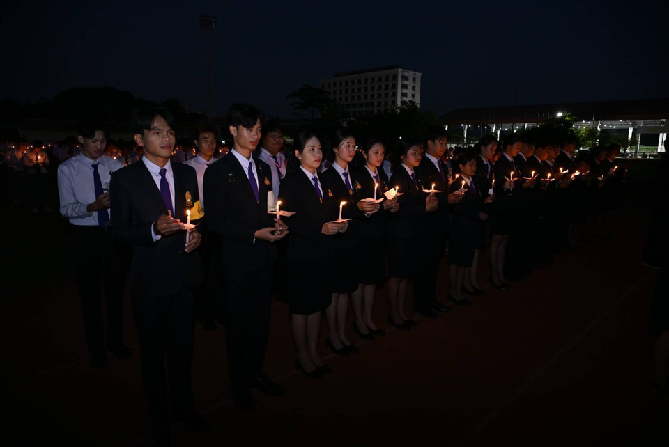 ก่อนจะร่วมกันจุดเทียน แปรอักษรเป็นภาพริบบิ้น พร้อมข้อความ ‘พระพันปีหลวง มรภ.บุรีรัมย์’ และขับร้องเพลงสดุดีแม่พระไทย เพลงสรรเสริญพระบารมี เพลงอาศริวาทราชภัฎ เพลงสดุดีพระแม่ไทย และเพลงชาติไทย จนเสียงดังกึกก้องทั่วพื้นที่ เป็นภาพที่สวยงามและยิ่งใหญ่ เต็มไปด้วยพลังแห่งความจงรักภักดี