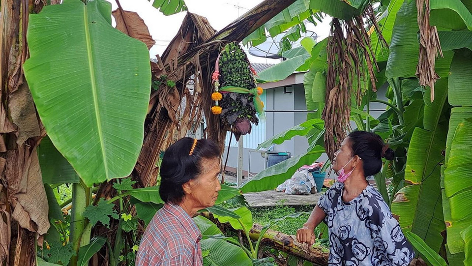 วันที่ 15 พ.ย.68 ผู้สื่อข่าวได้เดินทางไปที่บ้านเลขที่ 67/5 ม.1 ต.คลองข่อย อ.โพธาราม จ.ราชบุรี ภายหลังทราบว่ามีชาวบ้าน นำผ้าสามสีผูกรับขอโชคกล้วยประหลาดที่เข้าของตัดทิ้งแล้วยังออกเครือออกปลี ซึ่งหลังชาวบ้านนักเสี่ยงโชครู้ได้เดินทางมาดูต้นกล้วยประหลาด พบกับนายสังวรณ์ เคลอะคละ อายุ55ปี เจ้าของบ้าน พร้อมกับมีกลุ่มชาวบ้านมายืนล้อมดูต้นกล้วยประหลาด ซึ่งมี2ต้น เป็นกล้วยน้ำว้า ต้นแรกนั้นลำต้นหัก ยืนตาย แต่มีเครือกล้วยลูกเล็กจิ๋วออกมาเป็นจำนวนมาก ทางเจ้าของบ้านได้นำผ้าสามสีมาผูกไว้พร้อมพวงมาลัย ส่วนอีกต้น อยู่ห่างกันประมาณ 5 เมตร เป็นต้นกล้วยที่เจ้าของบ้านฟันทิ้ง แต่มีหน่อกล้วยและปลีขึ้นโผล่ออกมาตรงรอยมีดฟัน พร้อมกลับเอาผ้าสามสีมาผูกไว้ ซึ่งเป็นที่น่าประหลาดใจแก่ชาวบ้านที่พบเห็น