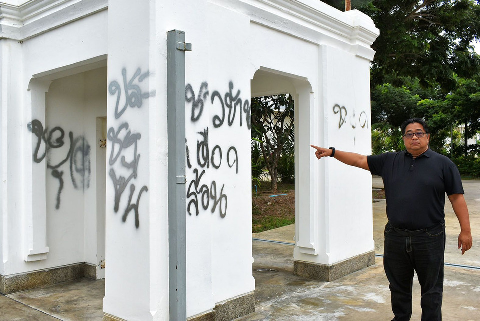 วันที่ 18 พ.ย.68 นายพิษณุ กล้าขาย อายุ 52 ปี อดีต สจ.ประจวบฯ เขตหัวหิน เปิดเผยว่า ตนในฐานะไวยาวัจกร ตัวแทนพระครูพิลาศบรรณวัตร เจ้าอาวาสวัดเขาไกรลาศ หมู่บ้านเขาตะเกียบ เขตเทศบาลนครหัวหิน นำภาพกล้องวรจรปิดเข้าแจ้งความร้องทุกข์กับพนักงานสอบสวน สภ.หัวหิน หลังเมื่อวันที่ 15 พ.ย.ที่ผ่านมา เวลา 02.00 น.ได้มีชายวัยกลางคน 1 คน ขับรถปิกอัพ 4 ประตู สีบรอนซ์ ไม่ทราบทะเบียน มาจอดที่บริเวณหน้าวัดเขาไกรลาศ ก่อนลงจอดรถใช้สีสเปร์สีดำพ่นข้อความ “หยุดทำร้าย ปชช. - เลิกรังแกประชาชน” ที่บริเวณซุ้มประตูทางเข้าออกวัดและสะพานด้านข้างวัดดูไม่สวยงาม ซึ่งข้อความดังกล่าวทำให้วัดได้รับความเสียหาย ขอให้ตำรวจช่วยติดตามจับคนร้ายมาดำเนินคดีด้วย