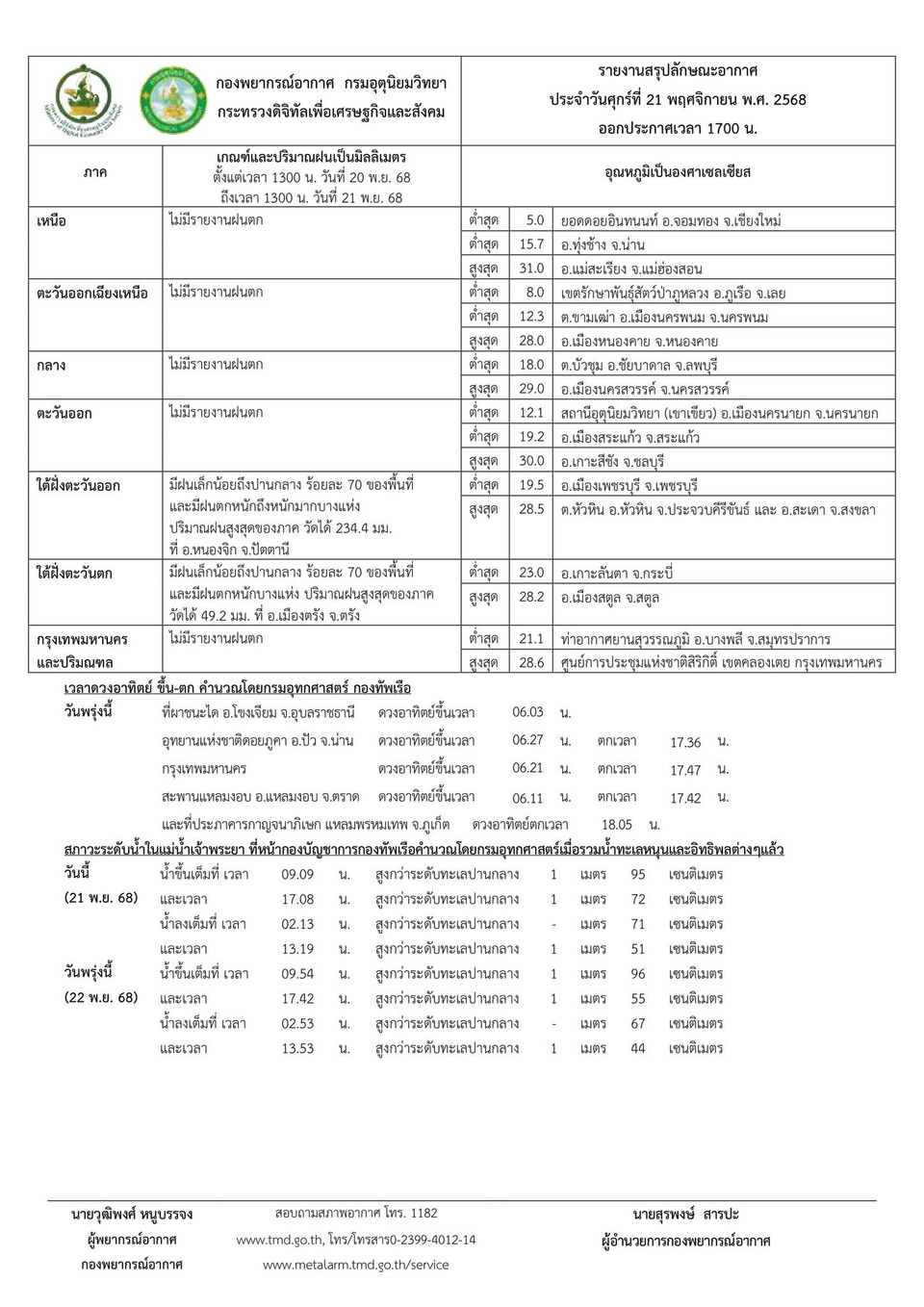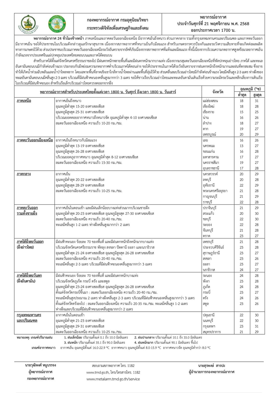 กรมอุตุนิยมวิทยาออกประกาศพยากรณ์อากาศฉบับลงวันที่ 21 พฤศจิกายน 2568 เตือนประชาชนในหลายพื้นที่ของประเทศ โดยเฉพาะภาคใต้และทะเลอ่าวไทย ให้เฝ้าระวังฝนตกหนักและคลื่นลมแรง ขณะที่ภาคเหนือและภาคตะวันออกเฉียงเหนือมีอากาศเย็นลงอย่างต่อเนื่อง
