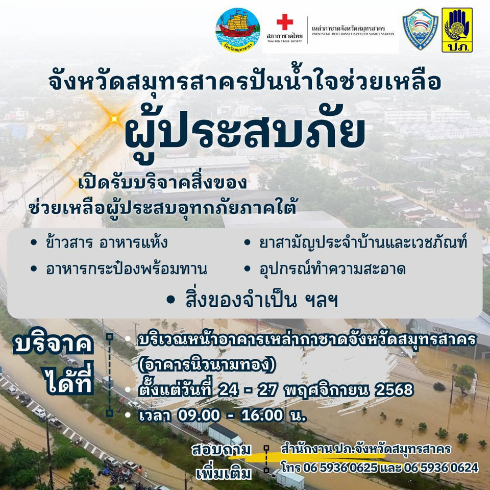 จังหวัดสมุทรสาครเปิดรับบริจาคน้ำเปล่า อาหารแห้ง ยารักษาโรค เพื่อช่วยผู้ประสบภัยน้ำท่วม จ.สงขลา สตูล นราธิวาส และพื้นที่เสี่ยง เปิดรับที่สำนักงานเหล่ากาชาด 24–27 พ.ย. 68