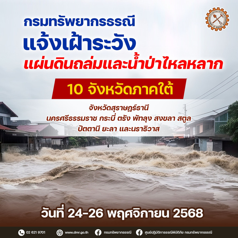 กรมทรัพยากรธรณี กระทรวงทรัพยากรธรรมชาติและสิ่งแวดล้อม ออกประกาศแจ้งเตือนเฝ้าระวังภัย แผ่นดินถล่มและน้ำป่าไหลหลาก ในพื้นที่ 10 จังหวัดภาคใต้ตอนล่าง ระหว่างวันที่ 24–26 พฤศจิกายน 2568 เนื่องจากมีฝนตกหนักต่อเนื่องและอาจส่งผลให้พื้นที่เสี่ยงเกิดภัยพิบัติได้