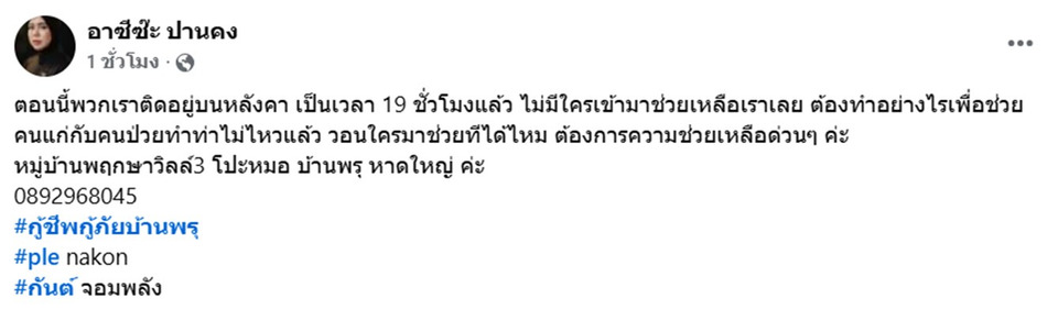 ตอนนี้พวกเราติดอยู่บนหลังคา เป็นเวลา 19 ชั่วโมงแล้ว ไม่มีใครเข้ามาช่วยเหลือเราเลย ต้องทำอย่างไรเพื่อช่วยคนแก่กับคนป่วยทำท่าไม่ไหวแล้ว วอนใครมาช่วยทีได้ไหม ต้องการความช่วยเหลือด่วนๆ ค่ะ