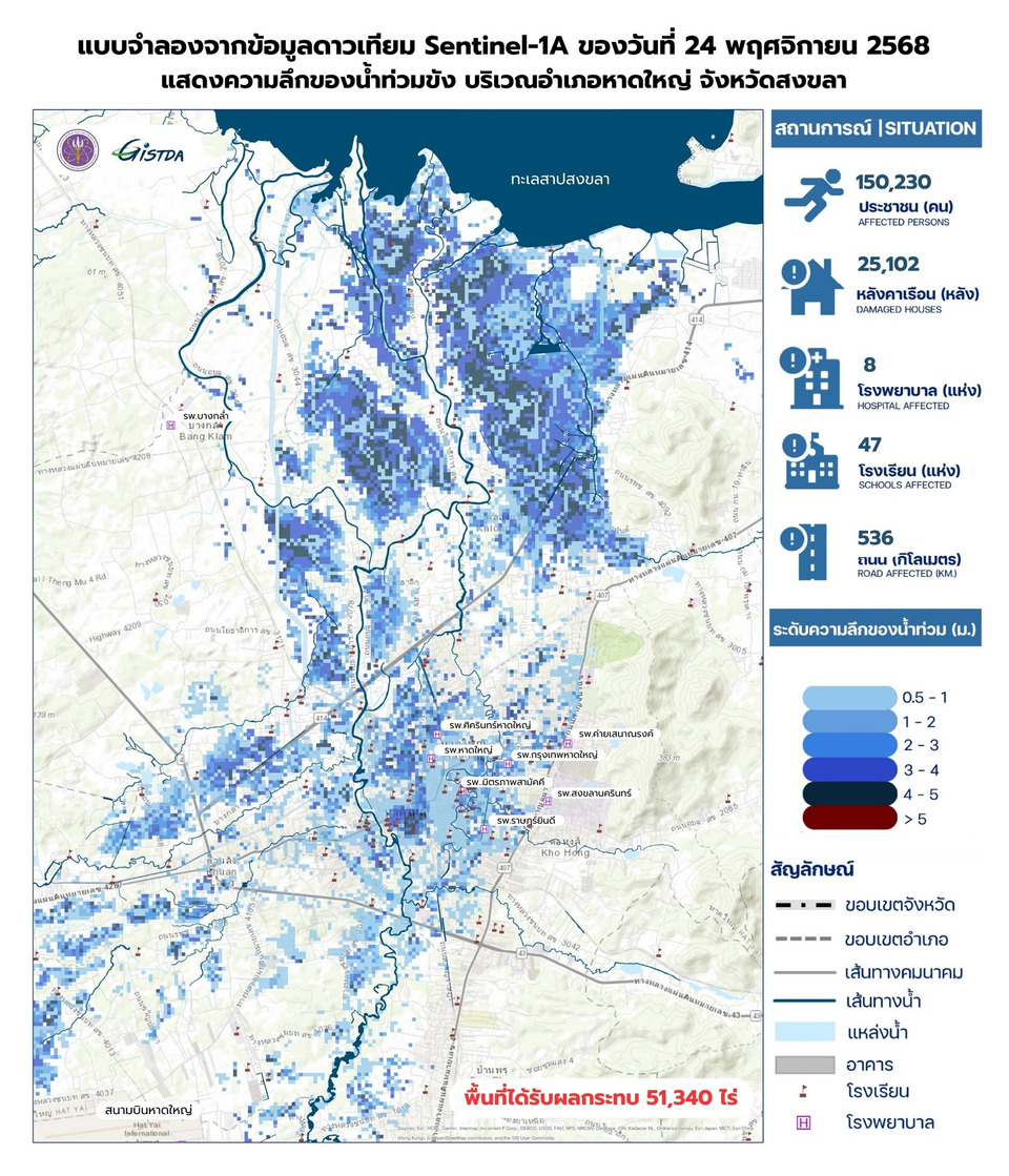 GISTDA เปิดแผนที่ดาวเทียมล่าสุด “หาดใหญ่” น้ำท่วมขั้นวิกฤต สูงสุดเกิน 4 เมตร ประชาชนเดือดร้อนกว่า 1.5 แสนคน