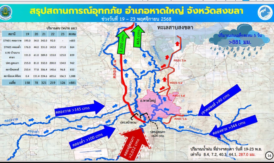วันที่ 25 พ.ย.68 นายธเนศ สมบูรณ์ ผู้อำนวยการสำนักบริหารจัดการน้ำและอุทกวิทยากล่าวว่า น้ำจากอำเภอสะเดาไหลมาถึงใจกลางนครหาดใหญ่ จังหวัดสงขลาแล้ว ตั้งแต่ช่วงเที่ยงที่ผ่านมา ปริมาณน้ำสูงสุดได้ผ่านพ้นไป ระดับน้ำจึงทรงตัวและเริ่มลดลงชั่วโมงละ 1 เซนติเมตร ซึ่งกรมอุตุนิยมวิทยาคาดการณ์ว่า วันนี้และพรุ่งนี้จะยังมีฝนต่อเนื่อง แต่ปริมาณฝนไม่มากเท่าสัปดาห์ที่แล้ว หลังวันที่ 26 พฤศจิกายน ฝนจะลดลง หากไม่มีฝนตกหนักในลุ่มน้ำอู่ตะเภา ระดับน้ำในเทศบาลนครหาดใหญ่จะเข้าสู่ระดับตลิ่งในวันที่ 27 พฤศจิกายนนี้เมื่อระดับน้ำเข้าสู่ลำน้ำ จะสามารถนำเครื่องสูบน้ำติดตั้งริมลำน้ำและคลองระบายน้ำต่างๆ ได้ซึ่งเตรียมไว้แล้ว พร้อมติดตั้งทันทีที่น้ำลดลงเท่าระดับตลิ่ง สำหรับใช้สูบน้ำที่ท่วมขังออก โดยคาดว่า สถานการณ์จะเข้าสู่ภาวะปกติใน 1 สัปดาห์