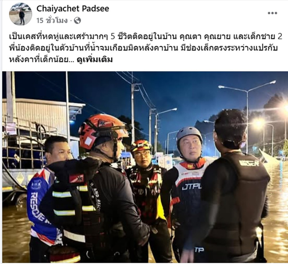 เกิดเหตุสะเทือนใจจากสถานการณ์อุทกภัยในพื้นที่ภาคใต้ หลังชาวบ้านครอบครัวหนึ่งต้องติดอยู่ภายในบ้านที่ถูกน้ำท่วมสูงเกือบถึงหลังคา ต่อเนื่องนานถึง 4 วัน โดยมีผู้ติดค้างภายในบ้านรวม 5 ชีวิต ประกอบด้วย คุณตา คุณยาย และเด็กชาย 2 คน