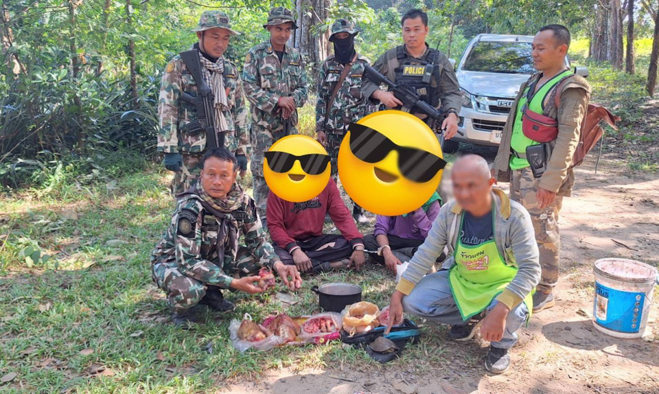 เมื่อวันที่ 30 พฤศจิกายน 2568 เจ้าหน้าที่เขตรักษาพันธุ์สัตว์ป่าห้วยทับทัน-ห้วยสำราญ,หน่วยพิทักษ์ป่าเขาศาลา,เจ้าหน้าที่สายตรวจส่วนกลางฯ, เจ้าหน้าที่ตำรวจชุด ปทส.กก.สืบสวน ภ.จว.สุรินทร์, และเจ้าหน้าที่ตำรวจชุดสืบสวน สภ.บัวเชด ได้ร่วมกันจับกุมตัว นายพัฒนโชติ (สงวนนามสกุล) อายุ 21 ปี ภูมลำเนาอยู่ที่ หมู่ 3 บ้านชำปะโต ต.อาโพน อ.บัวเขด จ.สุรินทร์ และนายชาญเดช (สงวนนามสกุล) อายุ 21 ปี ภูมลำเนาอยู่ที่ หมู่ 3 บ้านชำปะโต ต.อาโพน อ.บัวเชด จ.สุรินทร์ ได้ที่บริเวณกระท่อมในสวนยางพาราของนายสุทัศน์ (สงวนนามสกุล) พร้อมตรวจยึดอุปกรณ์และของกลางในการกระทำผิด ประกอบด้วย ซากอีเห็นลายพาด ถูกชำแหละเป็นชิ้นแล้ว ชั่งน้ำหนักรวมได้ 7.5 กิโลกรัม. เต่าใบไม้ หรือ เต่าแดง ตัวเต็มวัย จำนวน 1 ตัว . บ่วงแร้งเชือก จำนวน 30 อัน. ปืนหน้าไม้ จำนวน 2 กระบอก. ลำกล้องปืนแก๊ปยาว 100 เซนติเมตร จำนวน 2 ลำกล้อง . กรงดักสัตว์ จำนวน 1 อัน,กับดักสัตว์แบบหนีบ จำนวน 2 อัน และกระเป๋าเป้สะพายหลัง สีดำ จำนวน 1 ใบ