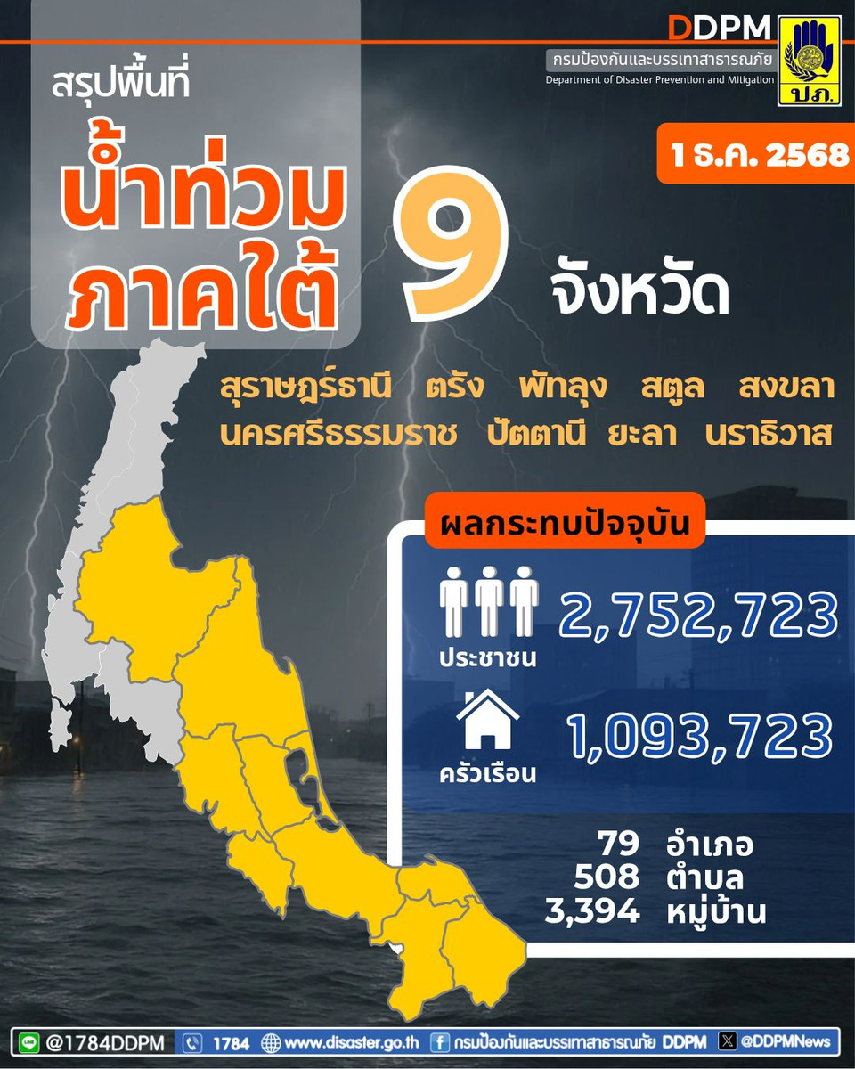 นายธีรพัฒน์ คัชมาตย์ อธิบดีกรมป้องกันและบรรเทาสาธารณภัย เปิดเผยว่า จากการติดตามสถานการณ์น้ำท่วมในพื้นที่ภาคใต้ ปัจจุบัน (ข้อมูล ณ วันที่ 1 ธ.ค. 68 เวลา 06.00 น.) ยังมีสถานการณ์อุทกภัยในพื้นที่ภาคใต้ ยังคงมีสถานการณ์ในพื้นที่ 9 จังหวัด ได้แก่ สุราษฎร์ธานี นครศรีธรรมราช ตรัง พัทลุง สตูล สงขลา ปัตตานี ยะลา และนราธิวาส กินพื้นที่ 79 อำเภอ 508 ตำบล 3,394 หมู่บ้าน ประชาชนได้รับผลกระทบ 1,093,723 ครัวเรือน 2,752,723 คน ดังนี้