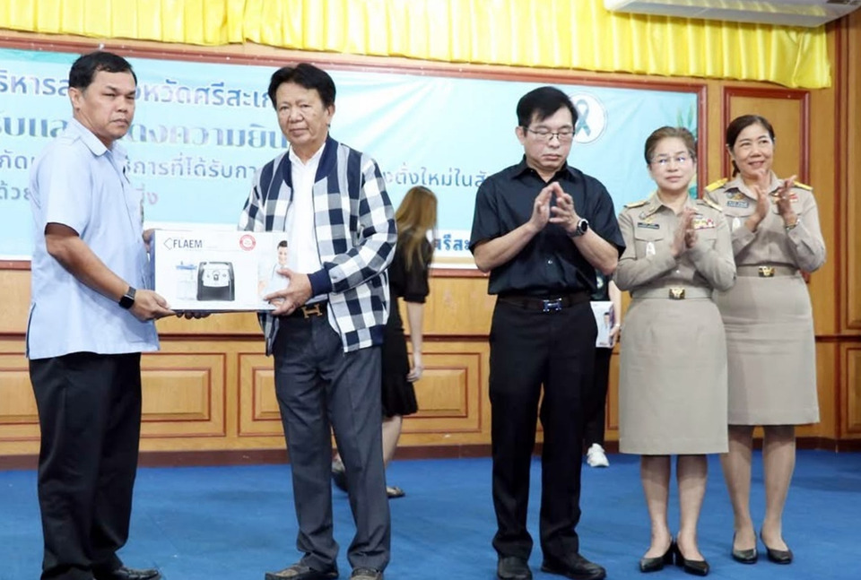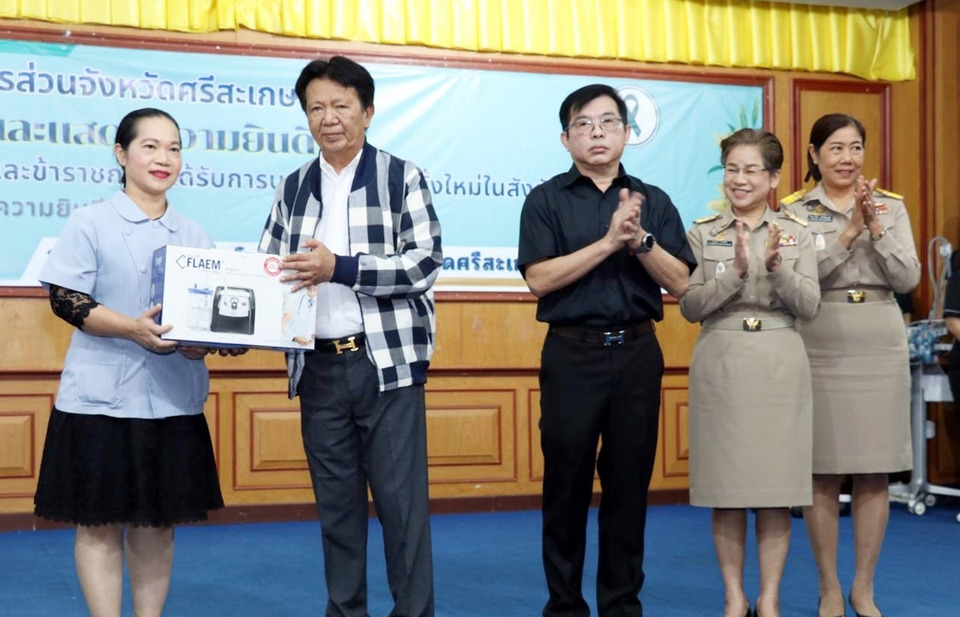 มอบเครื่องดูดเสมหะ จำนวน 5 เครื่อง แก่โรงพยาบาลส่งเสริมสุขภาพตำบลบ้านหนองไฮ อำเภอเมืองศรีสะเกษ จำนวน 1 เครื่อง และโรงพยาบาลส่งเสริมสุขภาพตำบลบ้านกุดโง้ง อำเภอเมืองศรีสะเกษ จำนวน 1 เครื่อง โรงพยาบาลส่งเสริมสุขภาพตำบลบ้านทุ่งรวงทอง อำเภอโนนคูณ จำนวน 1 เครื่อง โรงพยาบาลส่งเสริมสุขภาพตำบลบ้านบกขี้ยาง อำเภอกันทรารมย์ จำนวน 1 เครื่อง โรงพยาบาลส่งเสริมสุขภาพตำบลบ้านโคกเพชร อำเภอขุขันธ์ จำนวน 1 เครื่อง พร้อมด้วยเครื่องวัดความดันโลหิตชนิดอัตโนมัติ พร้อมวัดความอิ่มตัวของออกซิเจนในเลือด จำนวน 1 เครื่อง แก่โรงพยาบาลส่งเสริมสุขภาพตำบลบ้านชำเม็ง อำเภอกันทรลักษ์ มอบเครื่องตรวจวิเคราะห์ คลื่นไฟฟ้าหัวใจ พร้อมระบบประมวลผล จำนวน 1 เครื่อง แก่โรงพยาบาลส่งเสริมสุขภาพตำบลบ้านชำเม็ง อำเภอกันทรลักษ์ นอกจากนี้ยังได้เตรียมการมอบให้อีกหากมีงบประมาณเพิ่มเติม