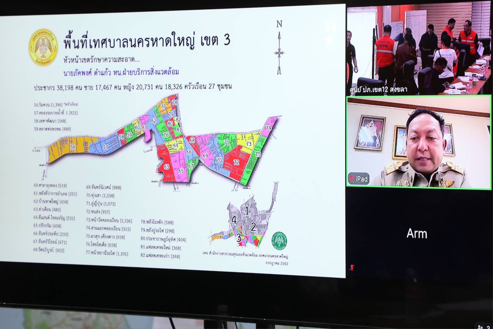 โดยการประชุมครั้งนี้ มีนายธีรพัฒน์ คัชมาตย์ อธิบดีกรมป้องกันและบรรเทาสาธารณภัย เข้าร่วมประชุมผ่านระบบ zoom และนายชัยรัตน์ แก้วเพียงเพ็ญ รองอธิบดีกรมป้องกันและบรรเทาสาธารณภัย นายจิรวัตร์ มณีโชติ รองผู้ว่าราชการจังหวัดสงขลา นายเกิดศักดิ์ ยะโสธร รองอธิบดีกรมโยธาธิการและผังเมือง ผู้แทนกรมการปกครอง ผู้แทนองค์การบริหารส่วนจังหวัดสงขลา และผู้แทนส่วนราชการในพื้นที่เข้าร่วมประชุม ณ ห้องประชุมต้นปาล์ม ศูนย์ ปภ. เขต 12 สงขลา ที่ตั้งของกองบัญชาการป้องกันและบรรเทาสาธารณภัยกลาง (ส่วนหน้า) จังหวัดสงขลา //////////