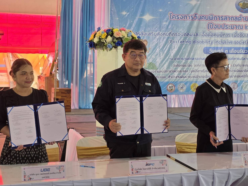 ผู้สื่อข่าวรายงานว่า เมื่อเร็วๆนี้ ที่อบต.ตะพง อ.เมือง จ.ระยอง นายภุชงค์ วีรวงศ์ เจ้าหน้าที่อาวุโส บริหารเขตประกอบการอุตสาหกรรมไออาร์พีซี และชุมชนสัมพันธ์ ร่วมพิธีลงนามบันทึกข้อตกลง MOU ระหว่างองค์การบริหารส่วนตำบลตะพง อำเภอเมืองระยอง สนง.พัฒนาสังคมและความมั่นคงของมนุษย์จังหวัดระยอง สมาคมคนพิการจังหวัดระยอง และมูลนิธิสายรุ้งเพื่อคนพิการ ชมรมคนพิการตำบลตะพง สนง.ส่งเสริมการเรียนรู้จังหวัดระยอง งานวันคนพิการสากลตำบลตะพง ประจำปี 2568