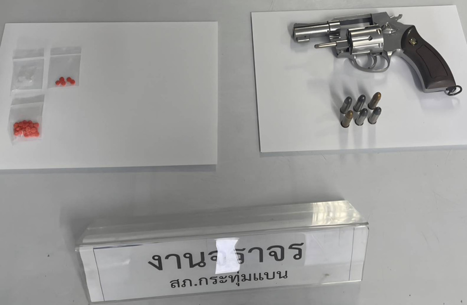 วันที่ 4 ธ.ค. 2568 พ.ต.ท.อาคม ตาใคร้ สารวัตรจราจร สถานีตำรวจภูธรกระทุ่มแบน จังหวัดสมุทรสาคร ได้เปิดเผยกับผู้สื่อข่าวว่า ขณะตั้งด่านตรวจสามารถจับกุมตัวคนร้ายวัยรุ่น2คนคาด่านของกลางมีทั้งยาบ้า ยาไอซ์และปืนเถื่อน พ.ต.อ.พศพงศ์ มณฑา ผกก.สภ.กระทุ่มแบน พ.ต.ท.ชุมพร ฉัตร์สงวนชัย รอง ผกก.ได้สั่งการให้ พ.ต.ท.อาคม ตาใคร้ พร้อมเจ้าหน้าที่ตำรวจจราจร ตั้งด่านตรวจบนถนนเศรษฐกิจก่อนถึง3แยกกระทุ่มแบน โดยที่ขณะเจ้าหน้าที่ตำรวจกำลังปฎิบัติหน้าที่อยู่ ได้มีชายวัยรุ่น2คนขี่รถจักรยานยนต์ช้อนท้ายแว้นกันมาเลนขวาด้วยความเร็ว เมื่อเห็นเจ้าหน้าที่ตำรวจตั้งด่านอยู่ข้างหน้าคนขับรถได้หยิบสิ่งของที่ซุกเหน็บอยู่ที่เอวโยนทิ้งเข้าข้างทางอย่างรวดเร็วแต่ไม่พ้นสายตาของเจ้าหน้าที่ตำรวจ ที่มองอยู่ เมื่อรถจักรยานยนต์ขี่มาถึงด่านเจ้าหน้าที่จึงได้สอบถามว่าจะรีบไปไหนขับมาซะเร็วเลย ขณะที่วัยรุ่นทั้ง2บอกว่าผมจะรีบไปทำงานครับ เดี๋ยวไม่ทันครับงานจะเข้าแล้ว มีท่าทีลุกลี้ลุกลน ทางเจ้าหน้าที่ตำรวจจึงทำการขอตรวจค้น มีนายอดิศร อายุ17 ปี เป็นคนขับขี่ นายเทพพิทักษ์ อายุ 23 ปี เป็นคนซ้อน พบยาบ้าและยาไอซ์อยู่ในกระเป๋าคาดเอว