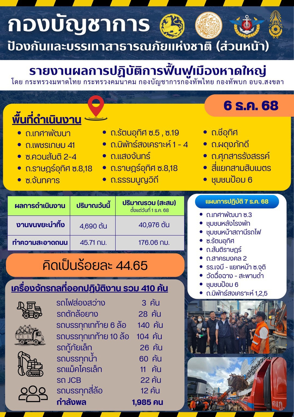 กองบัญชาการป้องกันฯ (ส่วนหน้า) รายงานผลการฟื้นฟูพื้นที่หาดใหญ่รวม 4 โซน คืบหน้ากว่า 44% วานนี้ขนขยะทิ้ง 4,690 ตัน ทำความสะอาดถนน 75.71 กม. รวมสะสม 40,976 ตัน และ 176.06 กม.