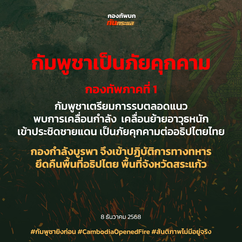 วันที่ 8 ธันวาคม 2568 สถานการณ์ความตึงเครียดตามแนวชายแดนไทย–กัมพูชายังคงทวีความรุนแรงขึ้นอย่างต่อเนื่อง โดยเพจ กองทัพบก ทันกระแส เผยข้อมูลล่าสุดว่า