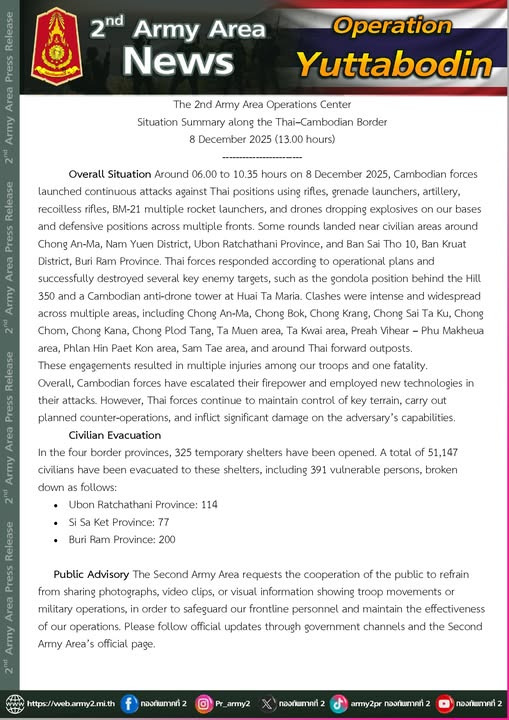 วันที่ 8 ธ.ค.68 ศูนย์ปฏิบัติการพื้นที่กองทัพบกที่ 2 สรุปสถานการณ์ตามแนวชายแดนไทย-กัมพูชา8 ธันวาคม 2025 (13.00 ชั่วโมง)