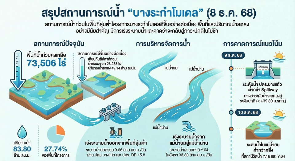 ขณะเดียวกันพื้นที่น้ำท่วมในทุ่งลุ่มต่ำ อำเภอบางระกำ เจ้าหน้าที่ชลประทาน ยังคงเร่งระบายน้ำออก ผ่านแม่น้ำยมสายหลัก และ ผันน้ำไปลงแม่น้ำน่าน ผ่านทางคลองระบายน้ำ DR-15.8 และ คลองระบายน้ำ DR-2.8 ต่อเนื่อง เพื่อเร่งให้ทุ่งลุ่มต่ำเข้าสู่ภาวะปกติ สามารถทำการเพาะปลูกข้าวนาปรัง ได้ตามแผนบริหารจัดการน้ำตามปฏิทินเพาะปลูกฤดูแล้งปี 2568/69 อย่างไรก็ตามขณะนี้ได้เริ่มเข้าสู่ฤดูแล้งแล้ว จึงต้องให้ความสำคัญกับปัญหาภัยแล้ง ควบคู่กับการแก้ไขปัญหาอุทกภัยด้วย ตามมาตรการรองรับฤดูแล้ง ปี 2568/69 เพื่อดำเนินการป้องกันและบรรเทาปัญหาการขาดแคลนน้ำ พร้อมกักเก็บน้ำให้เพียงพอที่จะสนับสนุนการให้เพียงพอในการให้ความช่วยเหลือประชาชนในพื้นที่เสี่ยงได้ต่อไป