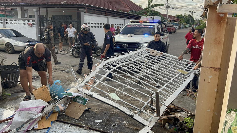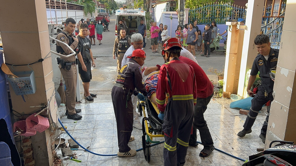 ในขณะเดียวกันตรวจสอบภายในตัวบ้าน มีผู้ได้รับบาดเจ็บสามราย โดยสองรายได้รับบาดเจ็บเล็กน้อย เจ้าหน้าที่กู้ภัยฯ ได้เคลื่อนย้ายส่งโรงพยาบาลก่อนหน้านี้แล้ว ส่วนรายที่สามเป็นภรรยาเจ้าของบ้านถูกกำแพงปูนถล่มทับติดอยู่ภายในห้องน้ำ เจ้าหน้าที่กู้ภัยฯ เร่งให้การช่วยเหลือ ปฐมพยาบาลเบื้องต้น ก่อนเคลื่อนย้ายส่งโรงพยาบาลอย่างเร่งด่วน