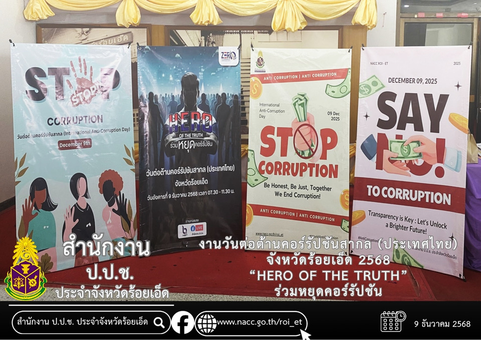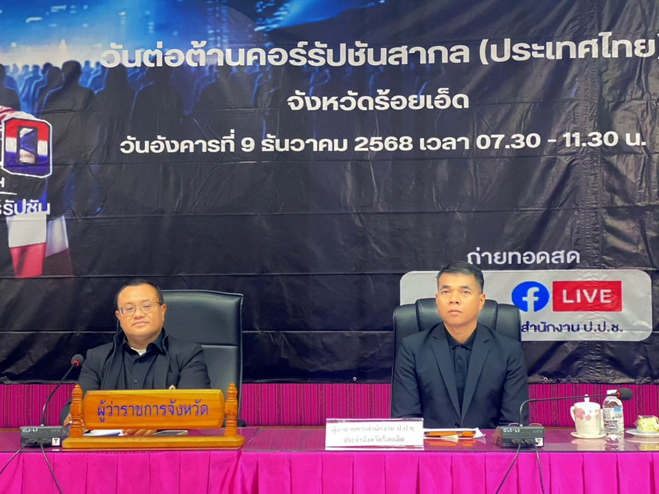 วันที่ 9 ธ.ค.68 ณ ห้องประชุมพระมหาเจดีย์ชัยมงคล ชั้น5 ศาลากลางจังหวัดร้อยเอ็ด นายชัชวาลย์ เบญจสิริวงศ์ ผู้ว่าราชการจังหวัดร้อยเอ็ด นายกุล ภาคเดียว ผู้อำนวยการสำนักงาน ป.ป.ช. ประจำจังหวัดร้อยเอ็ด นำทีมเจ้าหน้าที่ ผนึกกำลังร่วมกับจังหวัดร้อยเอ็ดและภาคีเครือข่ายทุกภาคส่วน จัดงานวันต่อต้านคอร์รัปชันสากล (ประเทศไทย) จังหวัดร้อยเอ็ด ประจำปี 2568