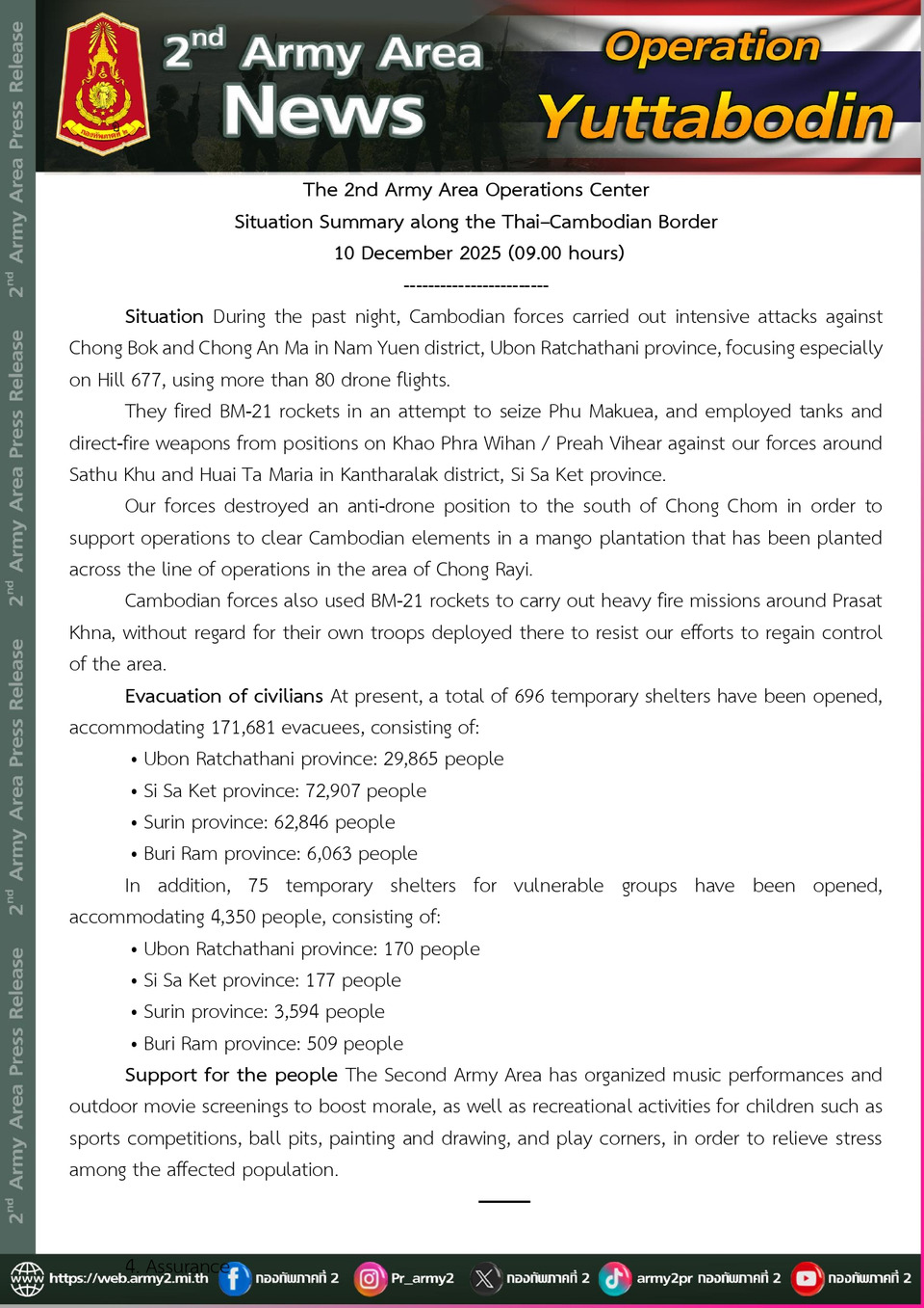 วันที่ 10 ธันวาคม 2568 เวลา 09.00 น. ศูนย์ปฏิบัติการกองทัพภาคที่ 2 รายงานสถานการณ์ล่าสุดตามแนวชายแดนไทย–กัมพูชา โดยระบุว่า