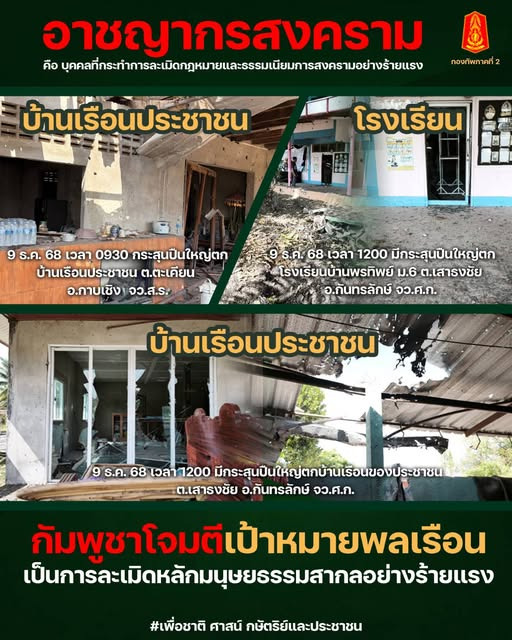 อาชญากรสงคราม! “กองทัพภาคที่ 2” ประณาม “กัมพูชา” โจมตีพลเรือน ระดมยิง “บ้าน–โรงเรียน” ละเมิดมนุษยธรรมสากลและข้อตกลงสงครามอย่างร้ายแรง