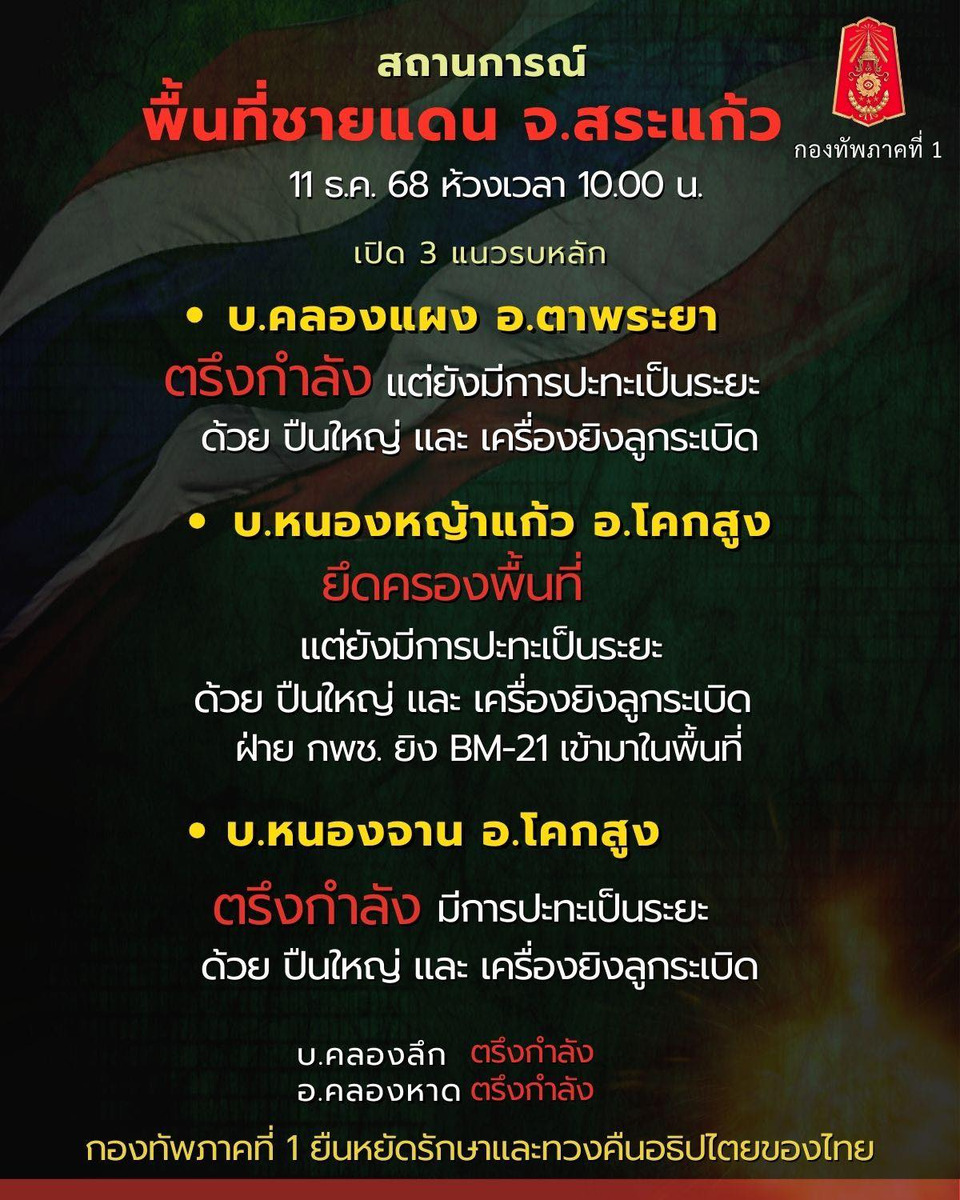 วันที่ 11 ธันวาคม 2568 เวลา 10.00 น. กองทัพภาคที่ 1 รายงานสถานการณ์ชายแดนจังหวัด สระแก้ว ว่า