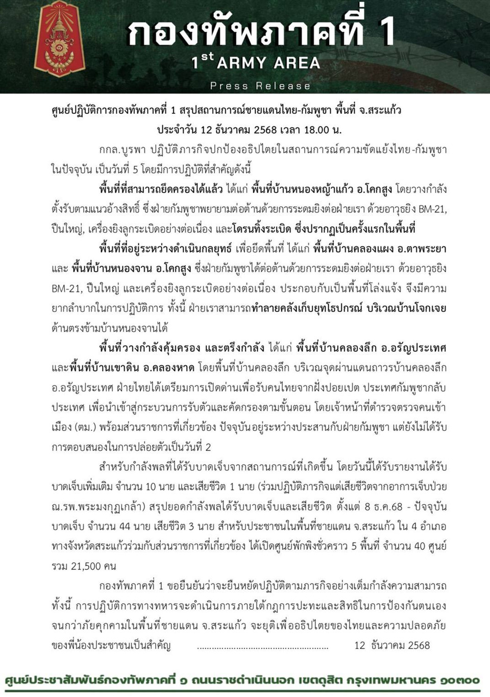 วันที่ 12 ธ.ค.68 ศูนย์ปฏิบัติการกองทัพภาคที่ 1 สรุปสถานการณ์ชายแดนไทย-กัมพูชา พื้นที่ จ.สระแก้วประจำวัน 12 ธันวาคม 2568 เวลา 18.00 น.