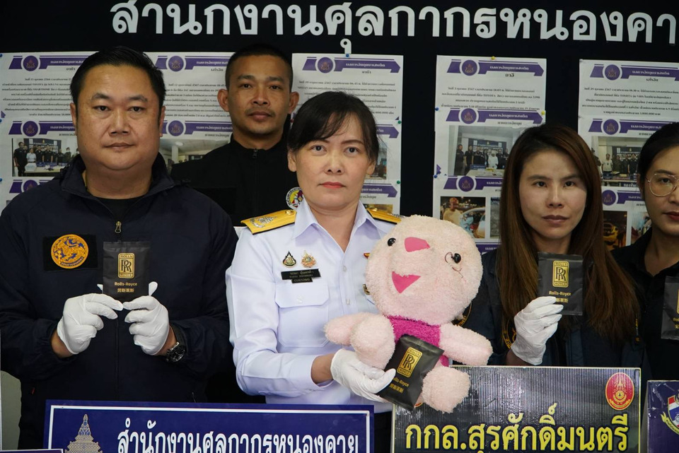 การจับกุมในครั้งนี้ เมื่อ 12 ธ.ค.68 หญิงลาว เดินทางเข้ามากับรถโดยสารระหว่างประเทศประจำสะพานมิตรภาพ ไทย-ลาว พร้อมกระเป๋าเดินทาง 1 ใบ และตุ๊กตา 1 ตัว เข้ามายังจุดตรวจสัมภาระผู้โดยสาร เจ้าหน้าที่ศุลกากรประจำด่านพรมแดนหนองคาย เจ้าหน้าที่ฯ ฝ่ายสืบสวนและปราบปราม ได้ตรวจกระเป๋าและสัมภาระของผู้โดยสาร ตามปกติ หญิงสาวดังกล่าวท่าทีมีพิรุธจะไม่ยอมให้ตรวจ เจ้าหน้าที่ตรวจลองจับตุ๊กตามีความแข็งความผิดปกติ ต่างจากตุ๊กตาทั่วไป จึงนำไปตรวจด้วยเครื่องเอกซเรย์ พบซองพลาสติกสีดำ โลโก้ Rolls-Royce จำนวน 25 ซอง ซุกซ่อนอยู่ภายในตุ๊กตาดังกล่าว ภายในบรรจุผงสีขาว จึงได้นำตัวอย่างผงสีขาวมาทดสอบด้วยน้ำยา ONCB051 Marquis Reagent โดยน้ำยาเปลี่ยนจากใสไม่มีสี เชื่อว่ามีส่วนผสมของสารเสพติดประเภท Methamphetamine เป็นยาเสพติดให้โทษประเภท 1 HAPPY WATER รวมจำนวน 25 ซอง น้ำหนักกว่า 1.5 กิโลกรัม เจ้าหน้าที่จึงนำตัวพร้อมของกลางส่ง สภ.เมืองหนองคายดำเนินคดีตามกฎหมายต่อไป