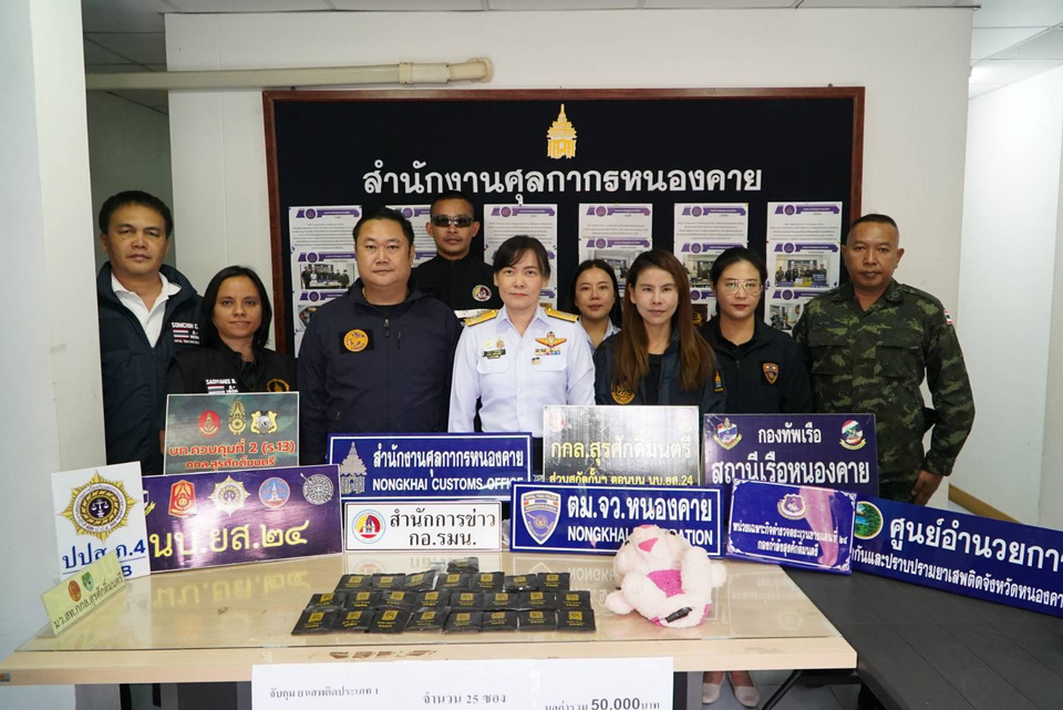 เมื่อวันที่ 12 ธันวาคม 2568 ผู้สื่อข่าวรายงานว่า ที่ ด่านพรมแดนหนองคาย สะพานมิตรภาพไทย-ลาว อ.เมืองหนองคาย นางสาววรรณา ผู้อุตส่าห์ นายด่านศุลกากรหนองคาย ปฏิบัติหน้าที่ ผู้อำนวยการสำนักงานศุลกากรหนองคาย,นางสาวกัญญ์ชิสา ประดิษฐสุวรรณ์ ผู้อำนวยการส่วนควบคุมทางศุลกากร,ร.อ.หาญชัย พรมบุญ หัวหน้าฝ่ายยุทธการและการข่าว บก.ควบคุที่ 2 กกล.สุรศักดิ์มนตรี,นายชัยสิทธิ์ คำภาจันทร์ หัวหน้าศูนย์อำนวยการป้องกันและปราบปรามยาเสพติดจังหวัดหนองคาย พร้อมหน่วยงานที่เกี่ยวข้อง ร่วมกันจับกุมผู้ต้องหาหญิงชาวลาว ได้ยาเสพติดให้โทษประเภท 1 Happy Water กว่า 1.5 กิโลกรัม