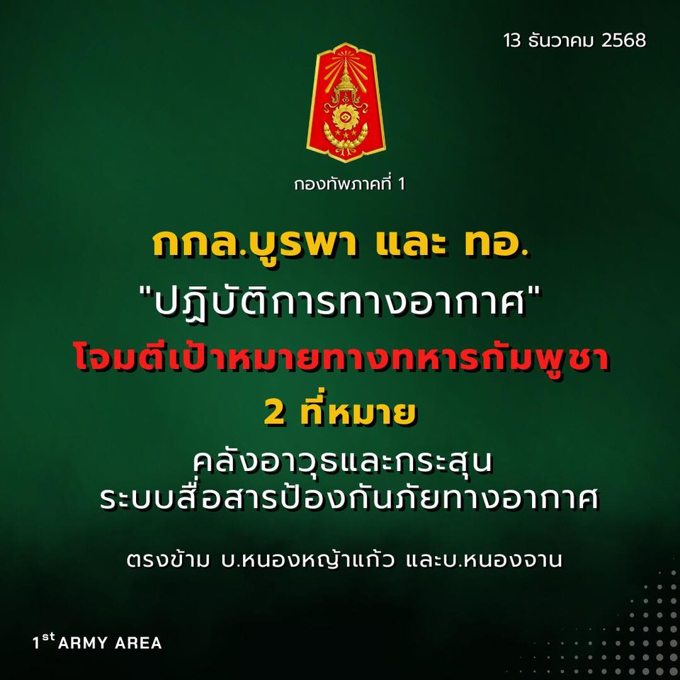 วันที่ 13 ธ.ค.68 เพจ ข่าวทหาร โพสต์ข้อความระบุว่า เมื่อ เวลา 16.09 น. กกล.บูรพา ร่วมกับ ทอ. ปฏิบัติการทางอากาศ ทำลายคลังอาวุธและกระสุน และระบบการสื่อสารป้องกันภัยทางอากาศของฝ่ายกัมพูชาในพื้นที่ตรงข้ามบ้านหนองหญ้าแก้วและบ้านหนองจาน