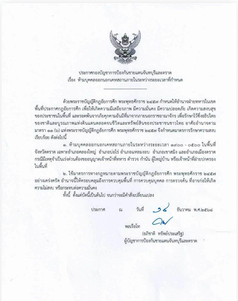 ประกาศกองบัญชาการป้องกันชายแดนจันทบุรีและตราด เรื่อง ห้ามบุคคลออกนอกเคหสถานภายในระหว่างระยะเวลาที่กำหนด ด้วยพระราชบัญญัติกฎอัยการศึก พระพุทธศักราช 2457 กำหนดให้อำนาจฝ่ายทหารในเขต พื้นที่ประกาศกฎอัยการศึก เพื่อให้เกิดความมีเสถียรภาพ มีความมั่นคง มีความปลอดภัย เกิดความสงบสุขของประชาชนในพื้นที่ และรอดพ้นจากภัยคุกคามอันมีที่มาจากภายนอกราชอาณาจักร เพื่อรักษาไว้ซึ่งอธิปไตย ของชาติและบูรณภาพแห่งดินแดนตลอดจนชีวิตและทรัพย์สินของประชาชนชาวไทย อาศัยอำนาจตาม มาตรา 11 (6 ) แห่งพระราชบัญญัติกฏอัยการศึก พระพุทธศักราช 2457 จึงกำหนดมาตรการรักษาความสงบ เรียบร้อย ดังต่อไปนี้