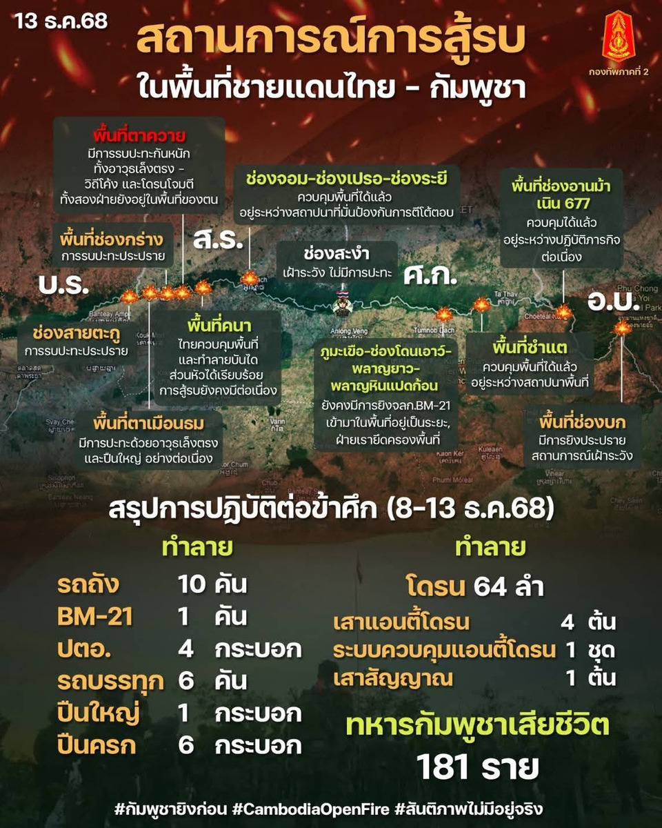 เมื่อวันที่ 14 ธ.ค.68 เพจเฟซบุ๊ก "กองทัพภาคที่ 2" โพสต์ข้อความระบุว่า สถานการณ์การสู้รบในพื้นที่ชายแดนไทย-กัมพูชา