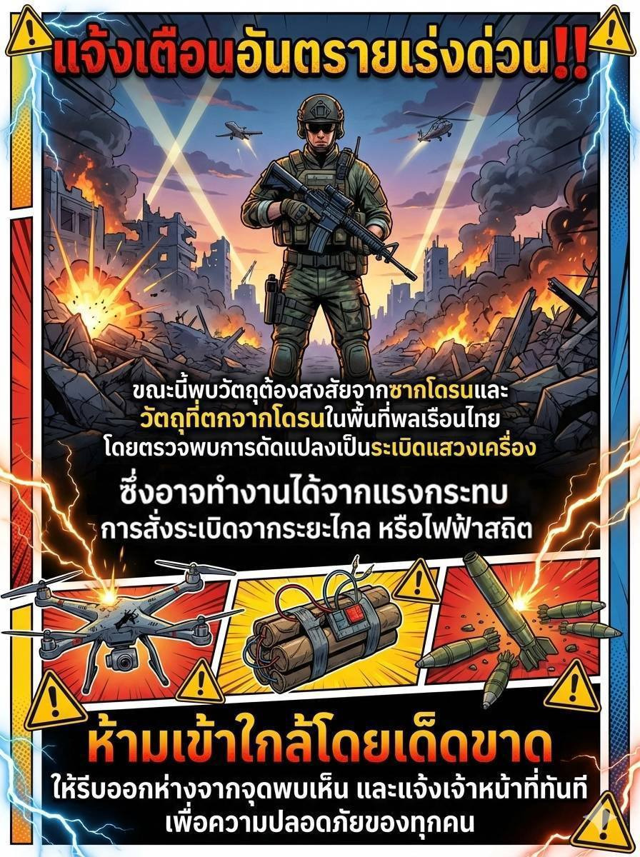 วันที่ 16 ธ.ค.68 เพจ กองทัพภาคที่ 2 แจ้งเตือน อันตราย !!! ขณะนี้พบวัตถุต้องสงสัยจากซากโดรนและวัตถุที่ตกจากโดรนในพื้นที่พลเรือนไทย ซึ่งอาจทำงานได้จากแรงกระทบ การสั่งการจากระยะไกล หรือไฟฟ้าสถิต