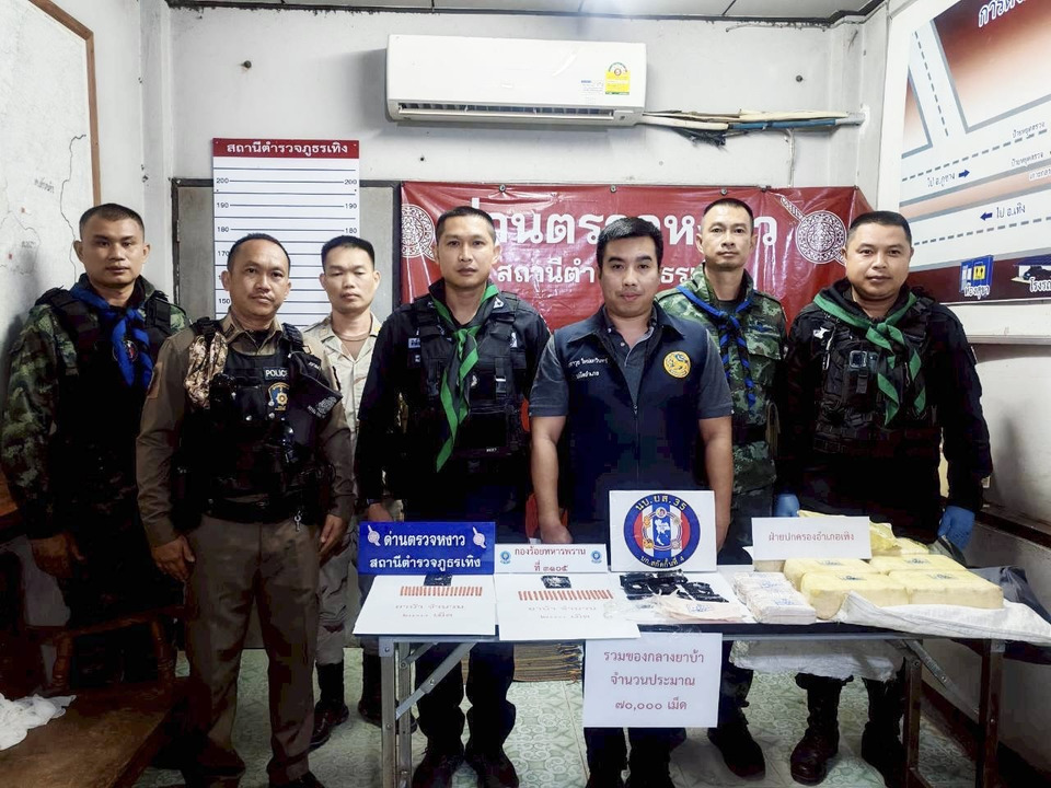 เมื่อเจ้าหน้าที่เห็นว่ามีพิรุธจึงได้นำรถออกติดตามไปจนถึงบริเวณข้างแยกอ่างเก็บน้ำห้วยดีหมี หมู่บ้านหัวดง หมู่ 12 ต.หงาว อ.เทิง จ.เชียงราย คนบนรถจักยานยนต์ได้ทิ้งสิ่งของบางอย่างเอาไว้ข้างทางก่อนจะอาศัยความมืดขับหลบหนีไปได้ เจ้าหน้าที่จึงเข้าตรวจวัตถุที่ทิ้งเอาไว้พบเป็นกระเป๋าใบเล็กเมื่อเปิดดูภายในปรากฎว่าบรรจุยาเสพติดประเภทยาบ้ารวมจำนวน 70,000 เม็ดดังกล่าว จึงทำการตรวจยึดไว้และนำส่ง สภ.เทิง ตามกฏหมายต่อไป
