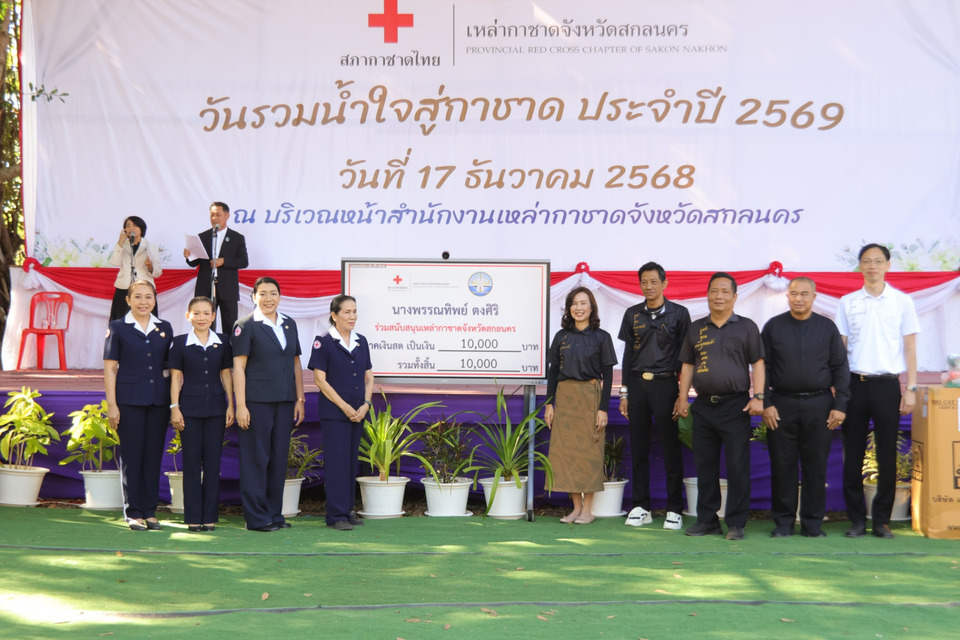 วันที่ 17 ธ.ค. 68 เวลา 09.00 น. ที่สำนักงานเหล่ากาชาดจังหวัดสกลนคร นางรณิดา เหลืองฐิติสกุล ผู้ว่าราชการจังหวัดสกลนคร ในฐานะนายกเหล่ากาชาดจังหวัดสกลนคร เป็นประธานเปิดงาน "วันรวมน้ำใจสู่กาชาด ประจำปี พ.ศ. 2569" โดยมี นางสาวจิราภรณ์ เบิกบานดี รักษาราชการแทนปลัดจังหวัดสกลนคร และเลขานุการเหล่ากาชาดจังหวัดสกลนคร เป็นผู้กล่าวรายงาน โดยมี รองผู้ว่าราชการ จังหวัดสกลนคร หัวหน้าส่วนราชการ ภาคเอกชน และประชาชนผู้มีจิตศรัทธาเข้าร่วมงานอย่างคับคั่ง