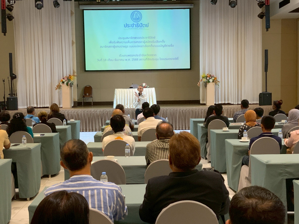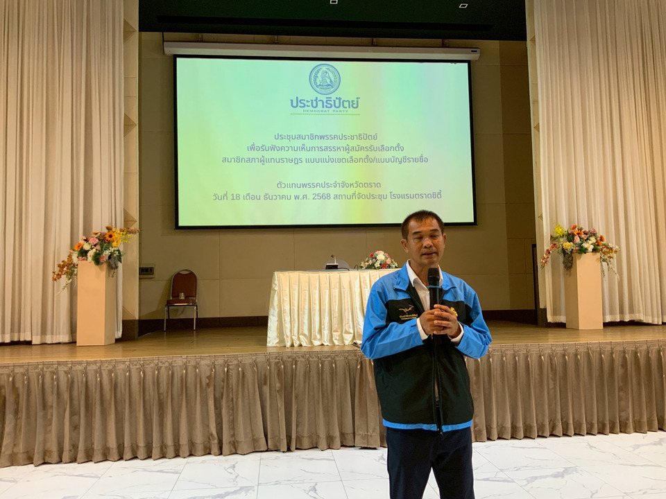 ผู้สื่อข่าวรานงานว่า การประชุมพรรคประชาธิปัตย์สาขาตราด ที่โรงแรมตราดซิตี้ อ.เมือง จ.ตราด วันนี้(เวลา 10.00 น. วันที่ 18 เดือน ธันวาคม พ.ศ. 2568)ของสมาชิกพรรคประชาธิปัตย์เพื่อรับฟังความเห็นการสรรหาผู้สมัครรับเลือกตั้งสมาชิกสภาผู้แทนราษฎร แบบแบ่งเขตเลือกตั้ง/แบบบัญชีรายชื่อที่มีตัวแทนพรรคประจำจังหวัดตราดและสมาชิกกว่า 200 คนร่วมประชุม มีนายธีระ สลักเพชร อดีตสส.ตราด 5 สมัยร่วมประชุมพร้อมนายศักดิ์ชัย เอี่ยมบุญฤทธิ์ ประธานสาขาพรรคร่วมประชุมพร้อมผู้ที่ได้รับการเสนอชื่อ 2 คน คือ นายรัฐ อภิบาลศรี และนายปรีชาวิชญ์ ฉิมผกา สมาชิกสภาอบจ.ตราด
