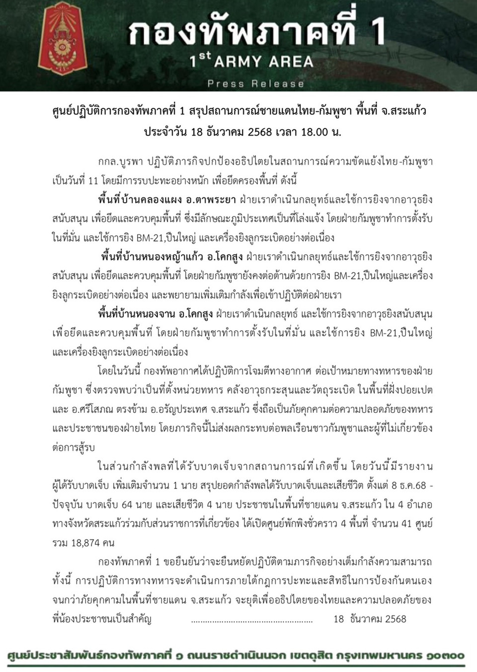 วันที่ 18 ธ.ค.68 ศูนย์ปฏิบัติการกองทัพภาคที่ 1 สรุปสถานการณ์ชายแดนไทย-กัมพูชา พื้นที่ จ.สระแก้ว ประจำวัน 18 ธันวาคม 2568 เวลา 18.00 น.