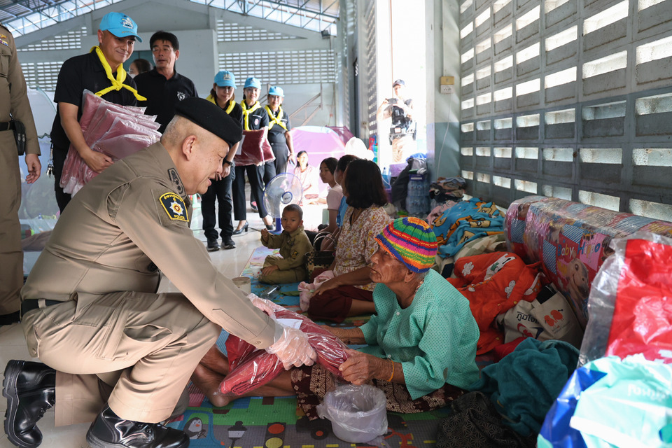ที่ศูนย์พักพิงชั่วคราว อ.ศีขรภูมิ จ.สุรินทร์ เมื่อวันที่ 19 ธ.ค.68 พล.ต.ต.สุคนธ์ ศรีอรุณ ผบก.ภ.จว.สุรินทร์ พร้อมด้วย พ.ต.อ.ชัยณรงค์ บุญด้วง รอง ผบก.ภ.จว.สุรินทร์, พ.ต.อ.นพดล ช่วยบุญ ผกก.สภ.ศีขรภูมิ นำข้าราชการตำรวจในสังกัด, คณะแม่บ้านตำรวจภูธรจังหวัดสุรินทร์ และข้าราชการตำรวจจิตอาสา ลงพื้นที่ตรวจเยี่ยมและให้กำลังใจประชาชน