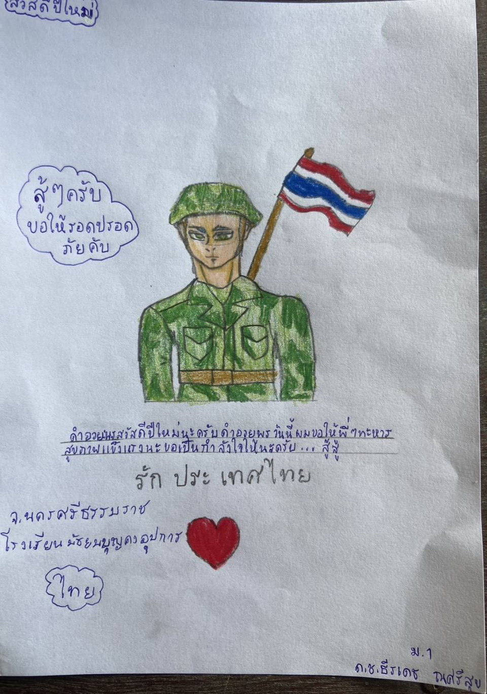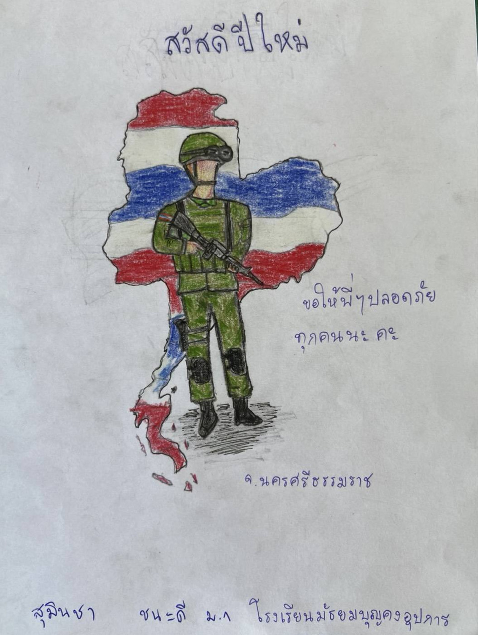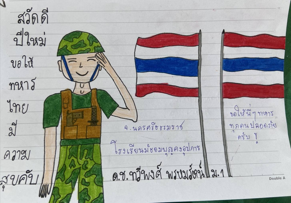 สำนักโฆษกกระทรวงกลาโหม เผยแพร่ภาพและข้อความสะท้อนพลังใจจากเยาวชนไทย หลังเด็กนักเรียนจากโรงเรียนในจังหวัดนครศรีธรรมราช ร่วมกันวาดภาพและเขียนข้อความให้กำลังใจ ส่งต่อถึงพี่ ๆ ทหารที่ปฏิบัติหน้าที่ดูแลความมั่นคงตามแนวชายแดนของประเทศ