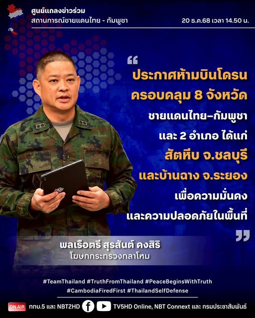 เพจสำนักโฆษกกระทรวงกลาโหมโพสต์ข้อความระบุว่าประกาศห้ามบินโดรนครอบคลุม 8 จังหวัดชายแดนไทย–กัมพูชา และ 2 อำเภอ ได้แก่ สัตหีบ จ.ชลบุรี และบ้านฉาง จ.ระยอง เพื่อความมั่นคงและความปลอดภัยในพื้นที่โดยพลเรือตรี สุรสันต์ คงสิริ โฆษกกระทรวงกลาโหมเปิดเผยข้อมูลนี้เมื่อวันที่ 20 ธ.ค. 68 เพื่อย้ำเตือนให้ประชาชนและผู้บังคับอากาศยานไร้คนขับปฏิบัติตามกฎระเบียบอย่างเคร่งครัดในเขตพื้นที่ควบคุมพิเศษเพื่อป้องกันการละเมิดมาตรการความมั่นคงของชาติ