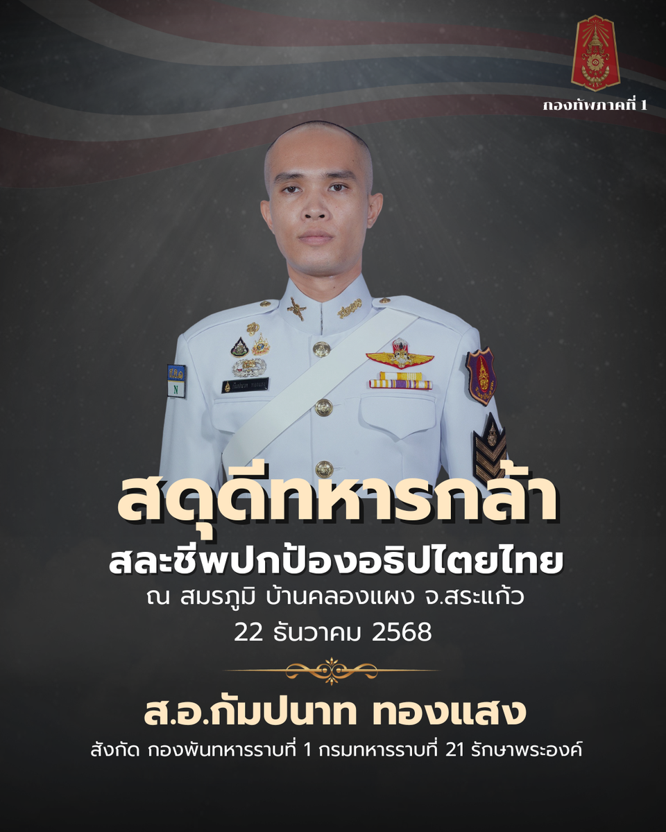 กองทัพภาคที่ 1 ขอแสดงความเสียใจอย่างสุดซึ้งต่อครอบครัว “ส.อ.กัมปนาท ทองแสง” สังกัด กองพันทหารราบที่ 1 กรมทหารราบที่ 21 รักษาพระองค์ เสียชีวิตจากการปฏิบัติหน้าที่ปกป้องอธิปไตยของชาติ ในพื้นที่ชายแดนไทย-กัมพูชา บ้านคลองแผง อ.ตาพระยา จ.สระแก้ว เมื่อ 22 ธ.ค.68