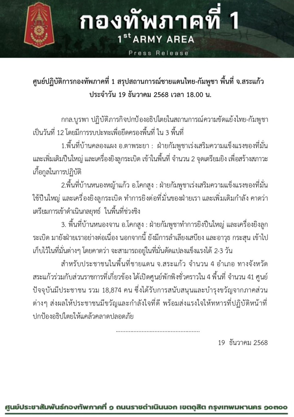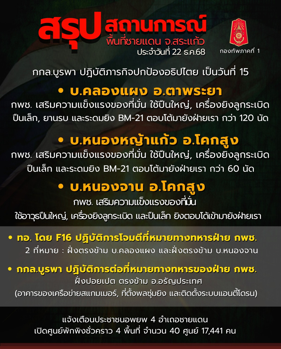 วันที่ 22 ธ.ค.68 ศูนย์ปฏิบัติการกองทัพภาคที่ 1 สรุปสถานการณ์ชายแดนไทย-กัมพูชา พื้นที่ จ.สระแก้วประจำวัน 22 ธันวาคม 2568 เวลา 18.00 น.