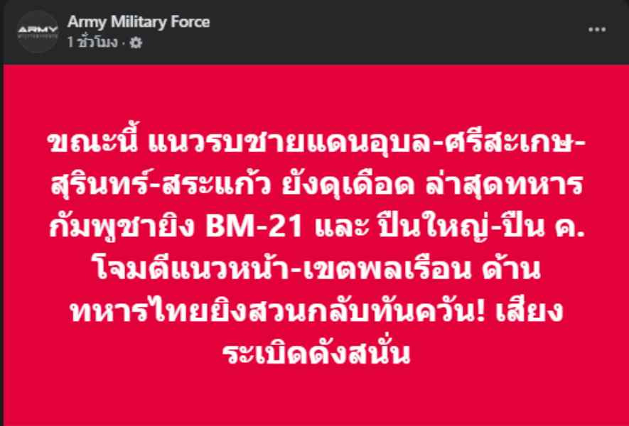 ขณะนี้ แนวรบชายแดนอุบล-ศรีสะเกษ-สุรินทร์-สระแก้ว ยังดุเดือด ล่าสุดทหารกัมพูชายิง BM-21 และ ปืนใหญ่-ปืน ค. โจมตีแนวหน้า-เขตพลเรือน ด้านทหารไทยยิงสวนกลับทันควัน! เสียงระเบิดดังสนั่น