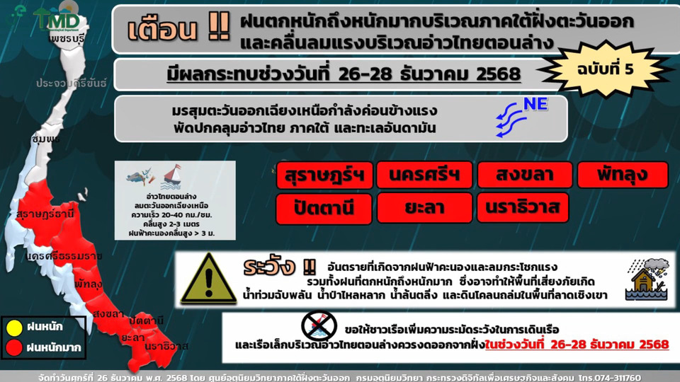ศูนย์อุตุนิยมวิทยาภาคใต้ฝั่งตะวันออก ประกาศฉบับที่ 5 (86/2568) เรื่อง ฝนตกหนักถึงหนักมากบริเวณภาคใต้ฝั่งตะวันออกและคลื่นลมแรงบริเวณอ่าวไทยตอนล่าง (มีผลกระทบช่วงวันที่ 26-28 ธันวาคม 2568) มรสุมตะวันออกเฉียงเหนือกำลังค่อนข้างแรงพัดปกคลุมอ่าวไทย ภาคใต้และทะเลอันดามัน ลักษณะเช่นนี้ทำให้ภาคใต้ฝั่งตะวันออกมีฝนหลายพื้นที่ และมีฝนหนักถึงหนักมาก ดังนี้ วันที่ 26 ธันวาคม 2568 มีฝนหนักถึงหนักมากบางแห่ง บริเวณจังหวัดสุราษฎร์ธานี นครศรีธรรมราช และพัทลุง มีฝนหนักหลายพื้นที่ และมีฝนหนักมากบางแห่ง สงขลา ปัตตานี ยะลา และนราธิวาส วันที่ 27-28 ธันวาคม 2568 มีฝนหนักถึงหนักมากบางแห่ง บริเวณจังหวัดสุราษฎร์ธานี นครศรีธรรมราช พัทลุง สงขลา ปัตตานี ยะลา และนราธิวาส