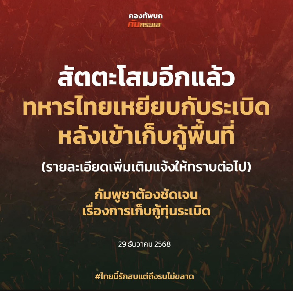 เมื่อวันที่ 29 ธ.ค. 68 ชุดตรวจค้นทุ่นระเบิดจาก กองร้อยทหารช่าง ซึ่งขึ้นสมทบ กองกำลังสุรนารี ได้เข้าปฏิบัติภารกิจในพื้นที่ สัตตะโสม อ.กันทรลักษ์ จ.ศรีสะเกษ กระทั่งเวลา 10.15 น. เกิดเหตุทหารนายหนึ่ง ประสบเหตุเหยียบกับระเบิด ระหว่างการปฏิบัติหน้าที่ ทราบชื่อคือ จ.ส.ต.สุจินต์ จิตกรียาน สังกัด ช.พัน.8 พล.ม.1 กรุ๊ปเลือด บี