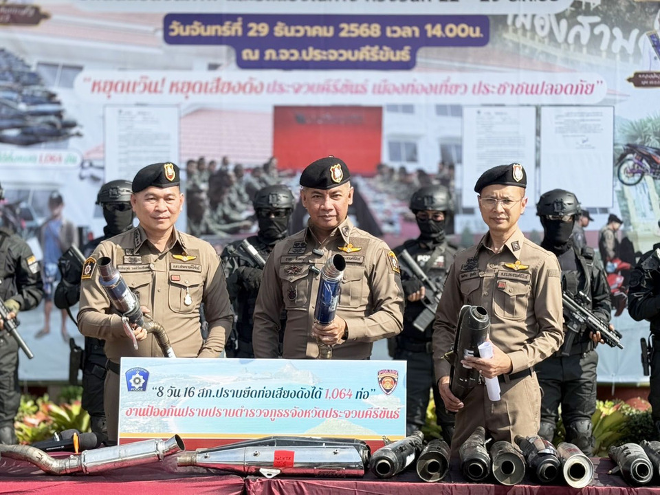 พล.ต.ต.อาทร ชิ้นทอง กล่าวว่า ที่ผ่านมาศูนย์รับแจ้งเหตุ 191 ตำรวจภูธรจังหวัดประจวบฯ ได้รับแจ้งเหตุจากประชาชนจำนวนมากเกี่ยวกับปัญหาความเดือดร้อนโดยเฉพาะกลุ่มวัยรุ่นผู้ขับขี่รถจักรยานยนต์แต่งซิ่งหรือเด็กแว้นในพื้นที่ต่าง ๆ จึงได้สั่งการทุก สภ.ให้ระดมสรรพกำลังออกวาดล้างรถแข่ง รถซิ่งในพื้นที่ โดยเฉพาะบน ถ.เพชรเกษม พบกลุ่มวัยรุ่นนำรถดัดแปลงสภาพมาขับขี่ในลักษณะประมาทหวาดเสียวโดยเฉพาะฝนช่วงเวลากลางคืน โดยเริ่มปฎิบัติการตั้งแต่วันที่ 22 - 29 ธ.ค.68 รวม 8 วัน สามารถตรวจยึดท่อไอเสียดัดแปลงมีค่าเสียงดังเกินกว่าที่กฎหมายกำหนดได้จำนวน 1,064 ท่อ มีผลการจับกุมที่สำคัญ เช่น สภ.หัวหิน จับกุมได้กว่า 200 ราย สภ.บางสะพานน้อย กว่า 150 ราย สภ.เมืองประจวบฯ กว่า 100 ราย สภ.บางสะพาน กว่า 100 ราย