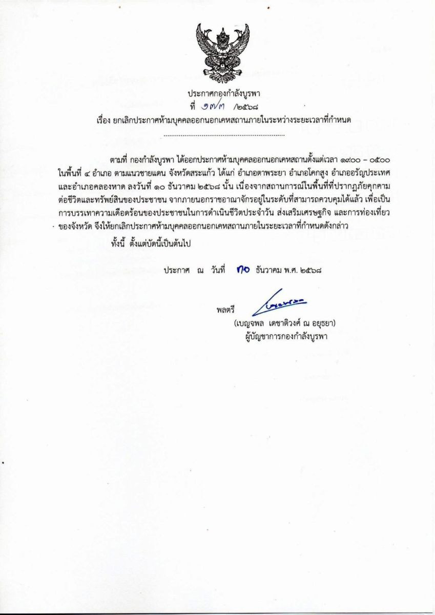 เมื่อวันที่ 30 ธ.ค.68 กองกำลังบูรพา กองทัพภาคที่ 1 ยกเลิกประกาศห้ามบุคคลออกนอกเคหสถานภายในระหว่างระยะเวลาที่กำหนด ตามที่ กองกำลังบูรพา ได้ออกประกาศห้ามบุคคลออกนอกเคหสถานตั้งแต่เวลา 19.00 น. - 05.00 น. ในพื้นที่อำเภอ ตามแนวชายแดน จังหวัดสระแก้ว ได้แก่ อำเภอตาพระยา อำเภอโคกสูง อำเภออรัญประเทศ และอำเภอคลองหาด ลงวันที่ 10 ธันวาคม 2568 นั้น
