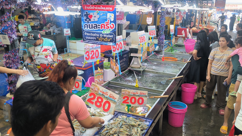 บรรยากาศในอาคารตลาดทะเล -กุ้ง-ปลา รวมทั้งเนื้อสัตว์ หมู เนื้อ ไก่ พบลูกค้ายืนต่อคิวเลือกซื้อกันอย่างคึกคักราวกับตั้งโรงทานแจกให้กินฟรี ผู้ค้าเน้นกำชับการหยิบหรือเลือกวัตถุดิบ ต้องใช้วัสดุตักอาหารใส่ถุง ป้องกันการปนเปื้อนของเชื้อโรค