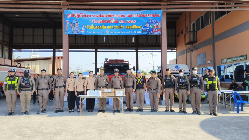 วันที่ 31 ธันวาคม 2568 เวลา พล.ต.ต.พิทักษ์ อุปพงษ์ ผบก.ภ.จว.นครปฐมพร้อมด้วย คุณ ปุญภา อุปพงษ์ ประธานแม่บ้านตำรวจภูธรจังหวัดนครปฐม เดินทางลงพื้นที่ตรวจเยี่ยมจุดบริการประชาชนเทศบาลตำบลสามง่าม อำเภอดอนตูม จังหวัดนครปฐม พร้อมมอบเครื่องอุปโภคบริโภคจำพวก น้ำดื่ม เครื่องดื่มชูกำลัง มาม่า กาแฟ อาหารว่างและสิ่งของอื่นๆเพื่อบำรุงขวัญและกำลังใจให้แก่เจ้าหน้าที่ที่ปฏิบัติหน้าที่จุดบริการประชาชนในช่วงเทศกาลปีใหม่ 2569 พร้อมแจกหมวกนิรภัยตาม “ โครงการ 1 หมวก 1 น้ำใจ พิทักษ์ภัยทางถนน ” ให้กับพ่อแม่ พี่น้องประชาชนที่ขับขี่รถจักรยานยนต์ ที่ใช้เส้นสัญจร ผ่านมาบริเวณจุดบริการประชาชนเพื่อลดความสูญเสียจากอุบัติเหตุทางถนน